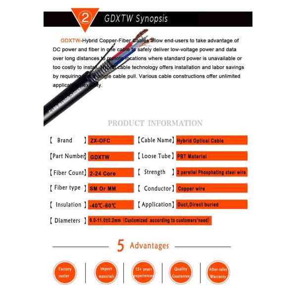 Composite 8 Core G652D Optical fiber+ Copper electric wire to hybrid fiber cable